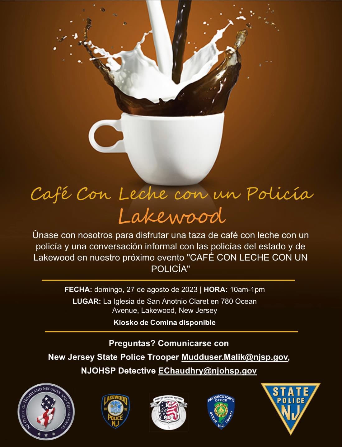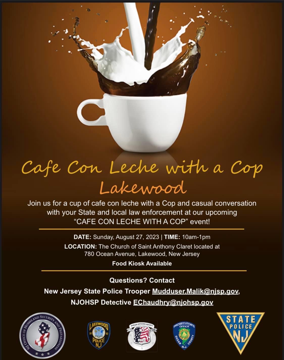 On Sunday, August 27, 2023, In collaboration with the Ocean County Prosecutor’s Office, the Union County Sheriff’s Office, Homeland Security, NJSP, and the Parish of Guadalupe for hosting the remarkable event “Café Con Leche with a Cop.”
