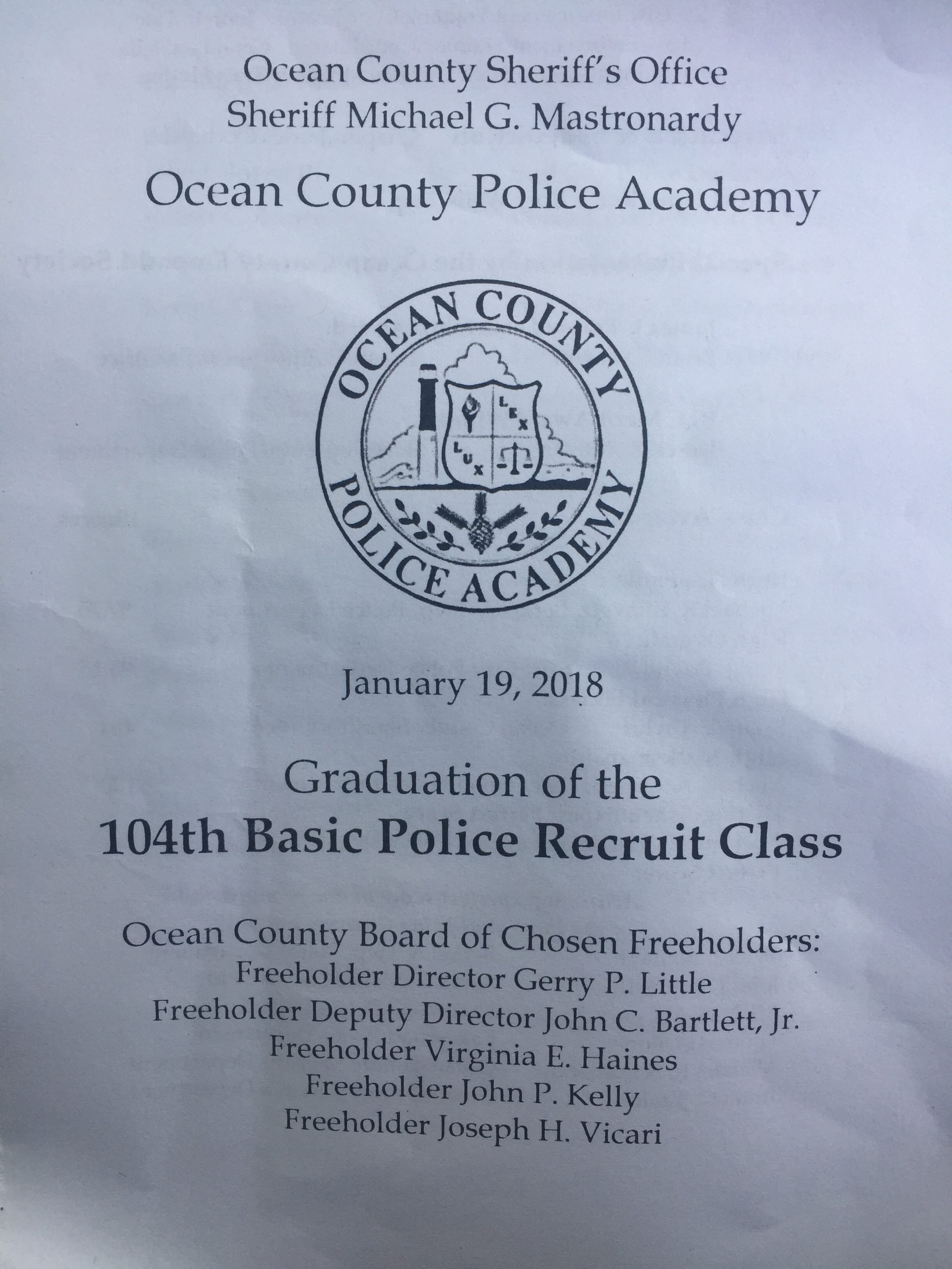 All were members of the Ocean County Police Academy Recruit Class 104 and have satisfactorily completed the rigorous 24 weeks of Basic Course For Police Officers training as prescribed by the Police Training Commission.