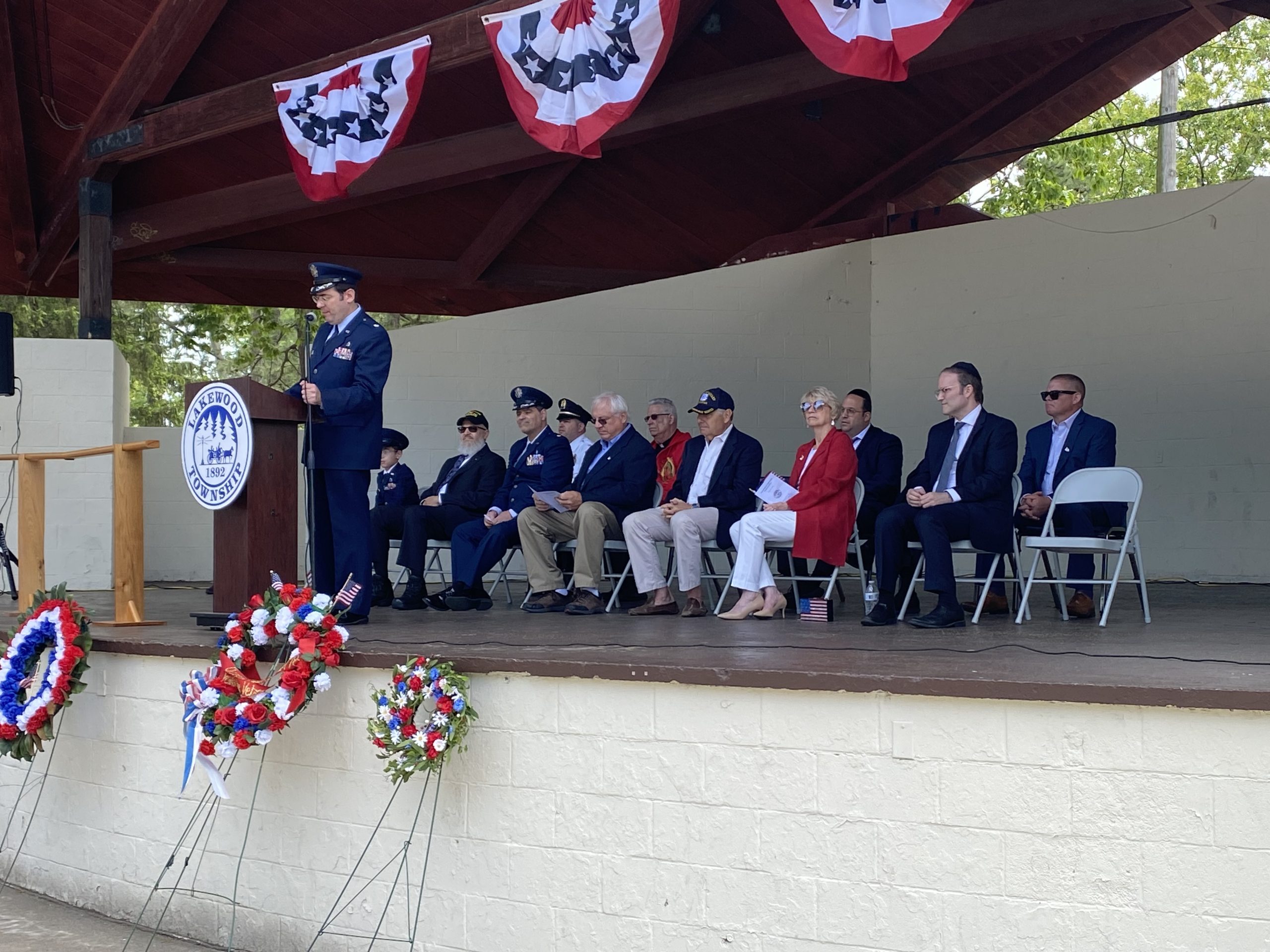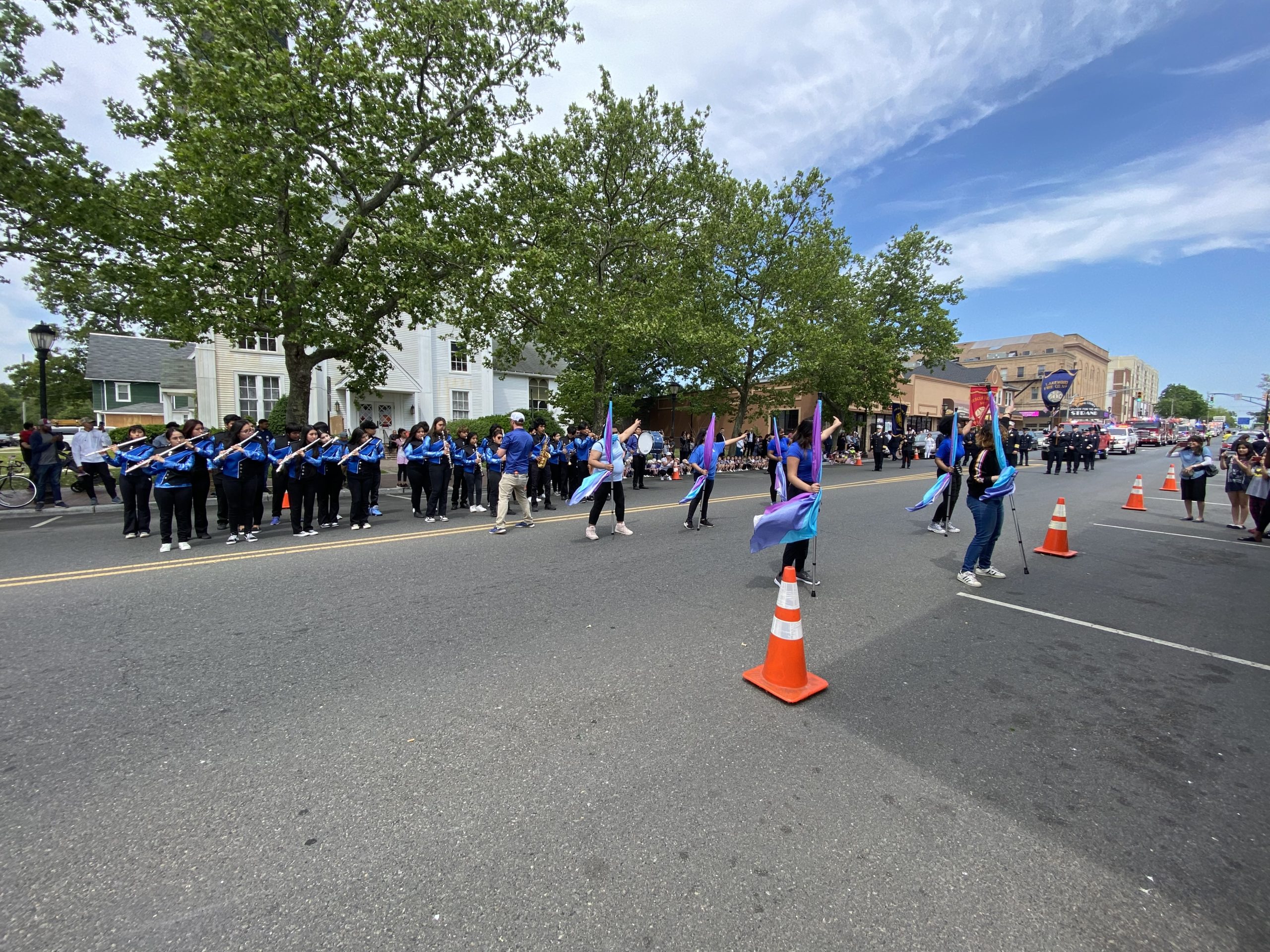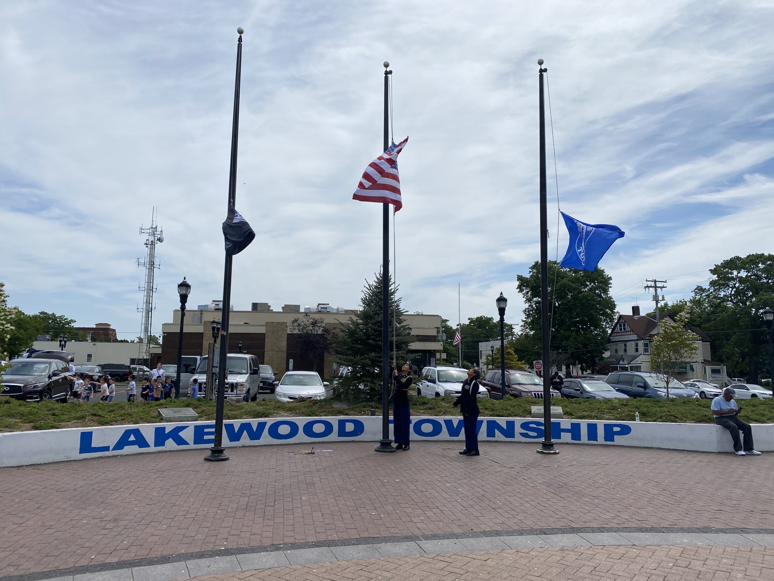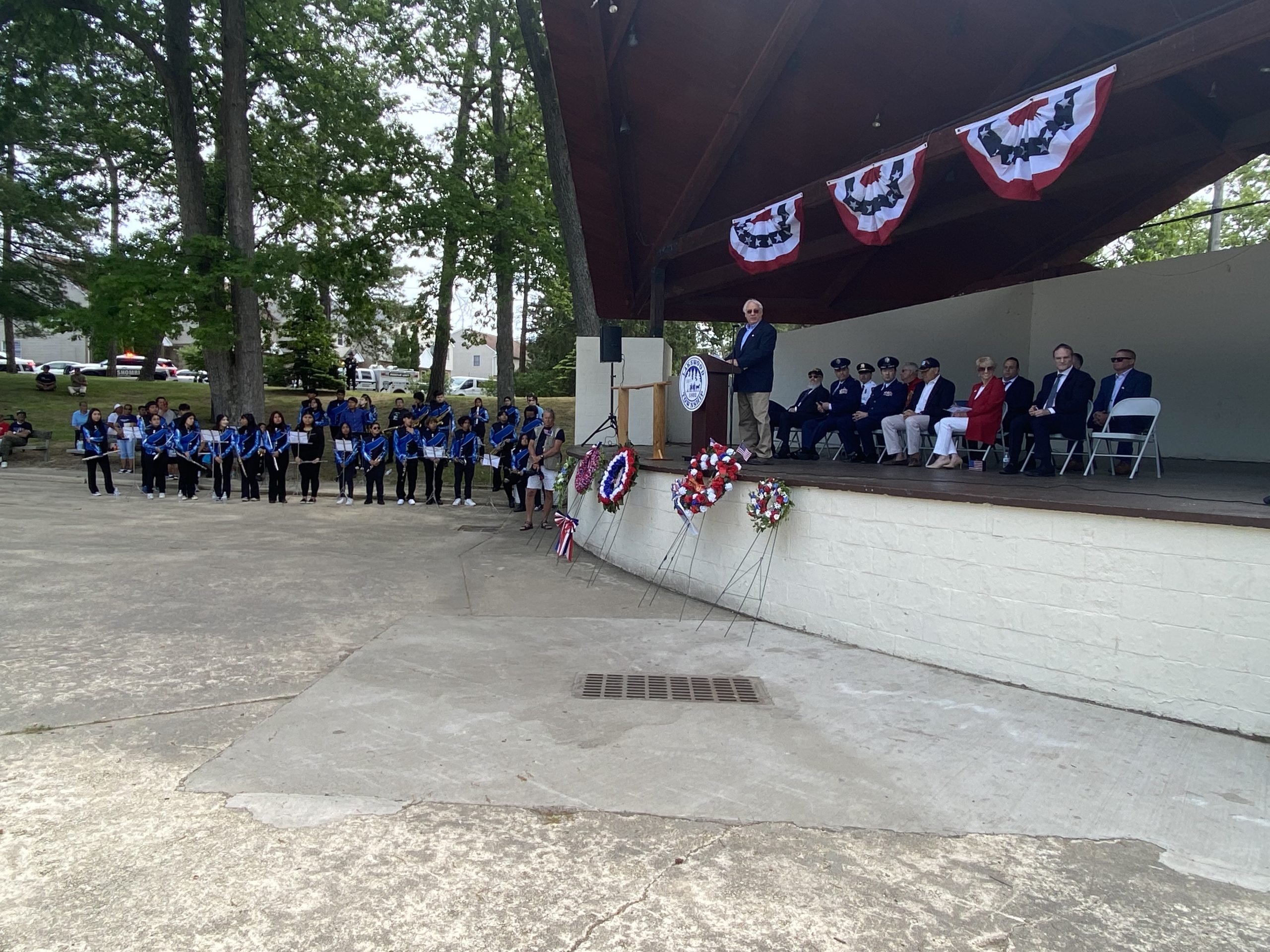 On Monday, May 29, 2023, the Lakewood Memorial Day Parade began with the raising of the Flag at Town Square at 11:00 am. At 11:15 the Lakewood High School marching Band stopped and played before the Township Committee.