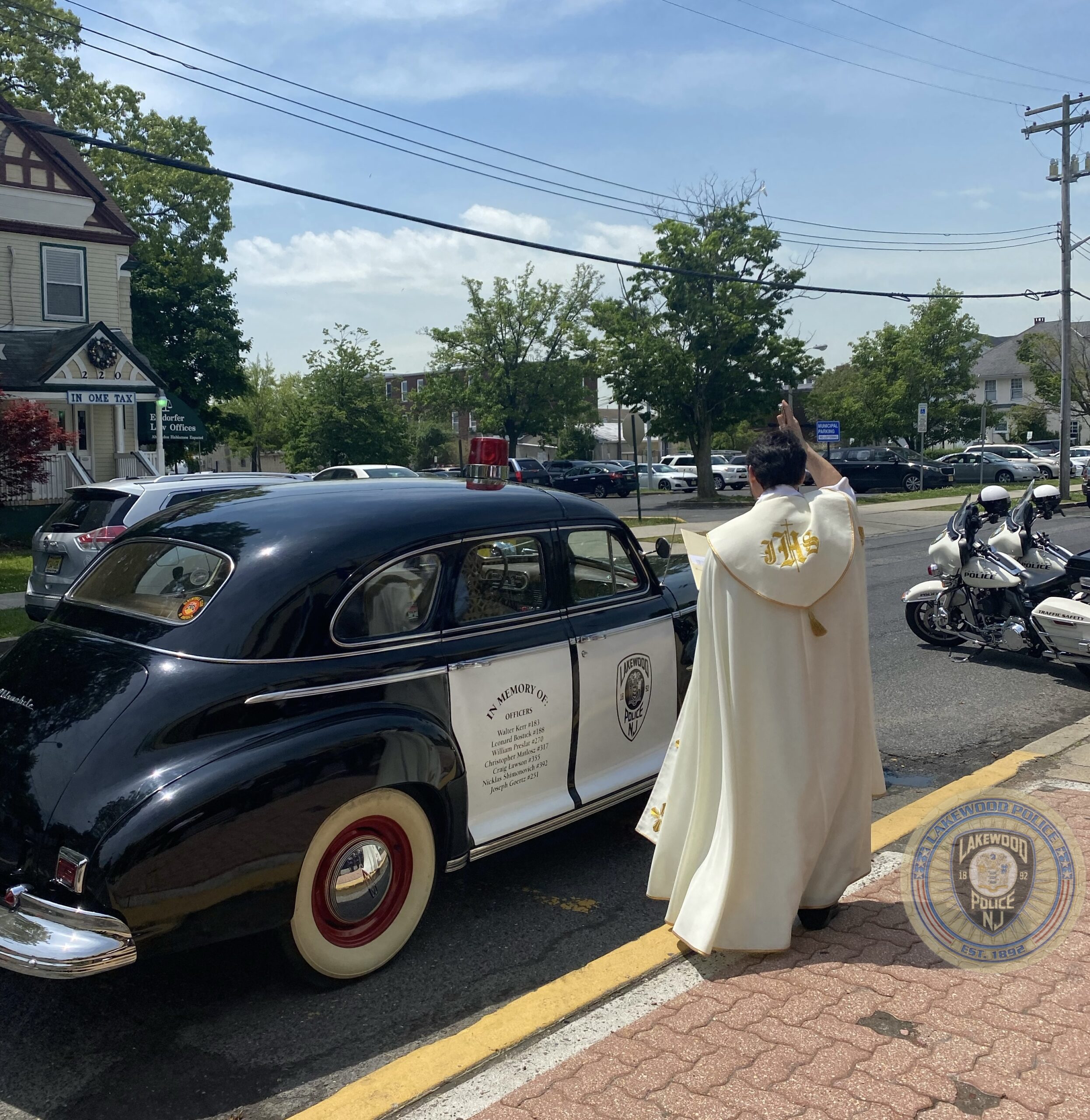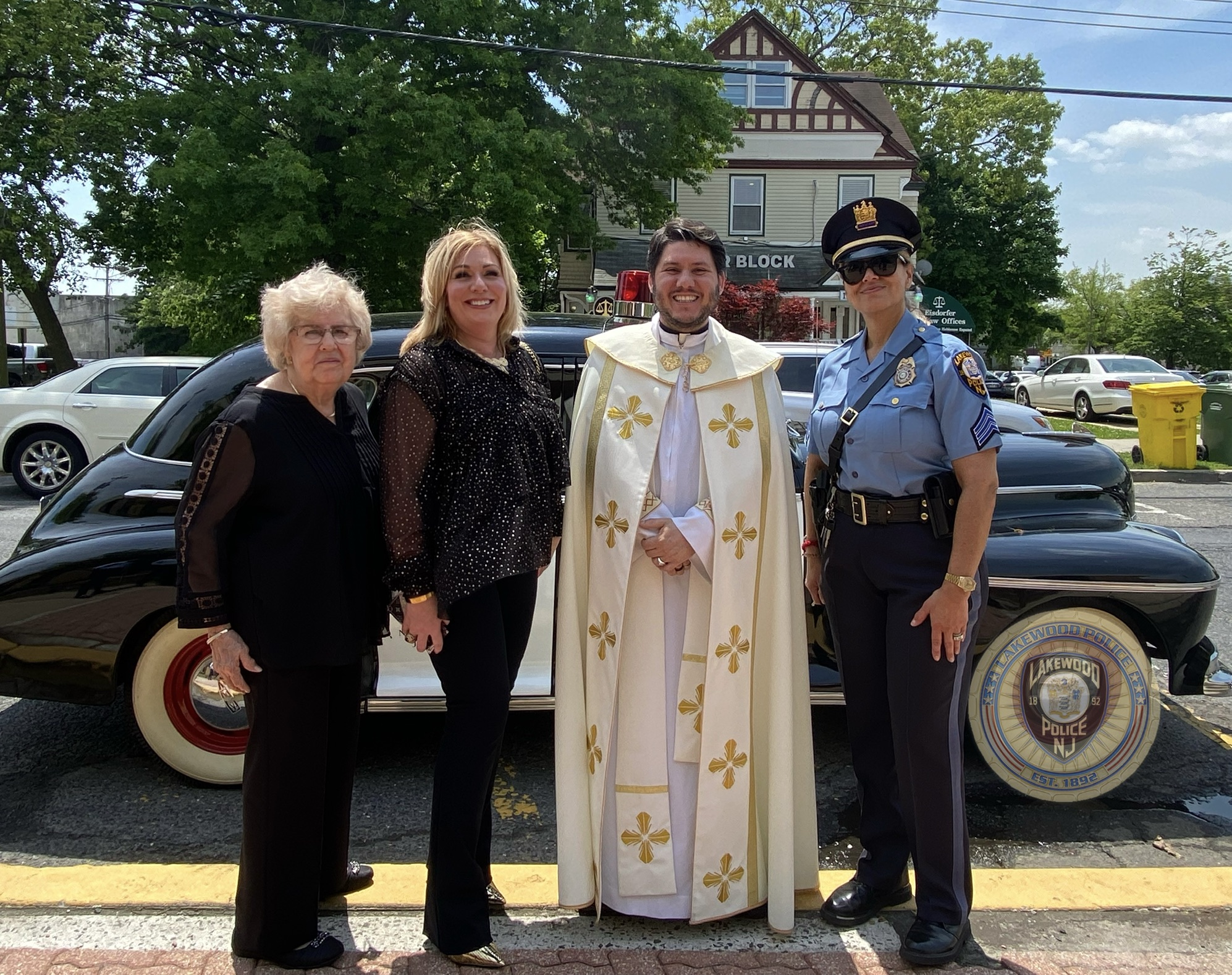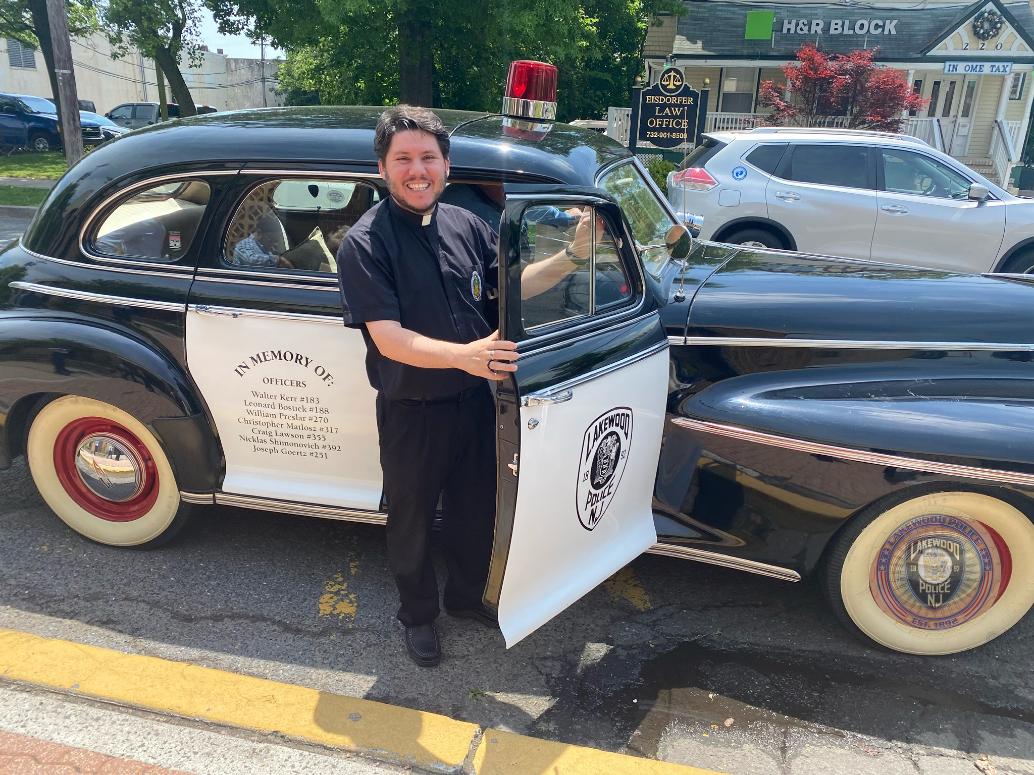 On Friday, May 20, 2022, Fr. Guilherme Andrino from St. Mary Lady of Guadalupe Catholic Church, Lakewood NJ., blessed the 1941 memorial Oldsmobile 4 door sedan that is owned and is on loan to the Lakewood Police Department by Mr. Shrage Pinter.